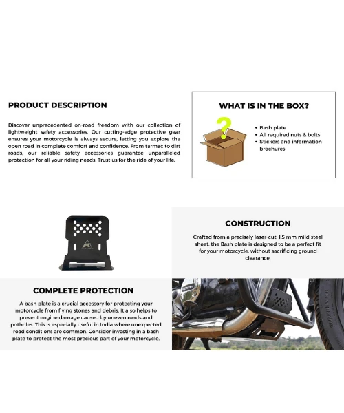 Construction: Crafted from a precisely laser-cut, 1.5 mm mild steel sheet, the Bash plate is designed to be a perfect fit for your motorcycle, without sacrificing ground clearance.