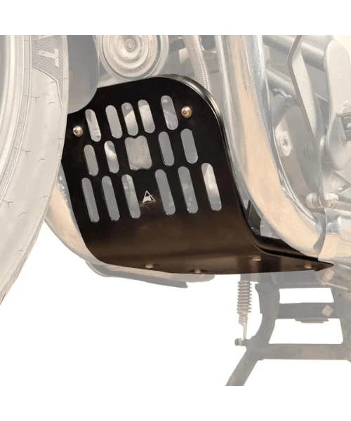 The bash plate is an integral part of the motorcycle, fitting precisely and providing both protection and aesthetic appeal. Its design allows for optimal ground clearance without sacrificing performance or style.