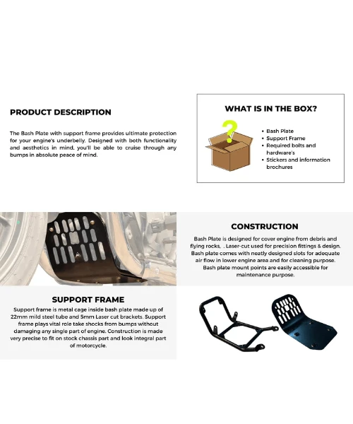 - Bash Plate is designed for cover engine from debris and flying rocks, Laser-cut used for precision fittings & design.