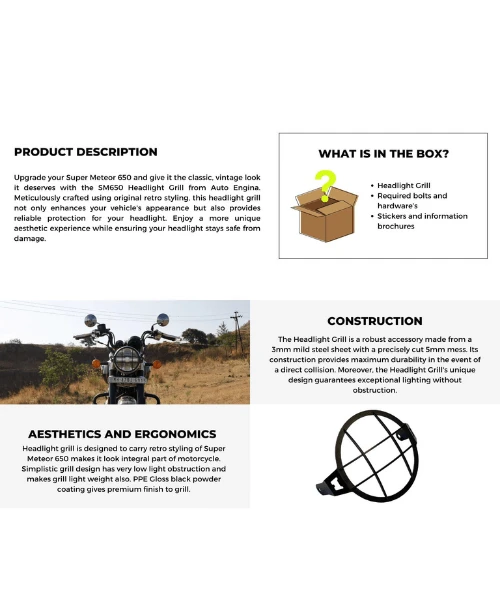 - Upgrade your Super Meteor 650 and give it the classic, vintage look it deserves with the SM650 Headlight Grill from Auto Engina.