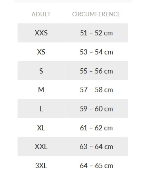| SIZE | HEAD CIRCUMFERENCE (CM) |