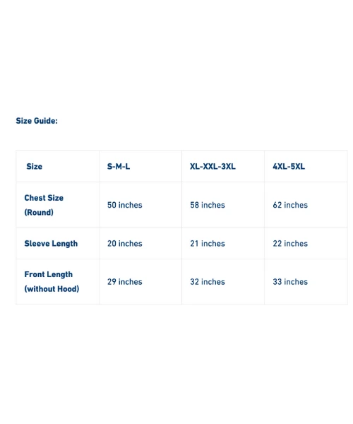 | Size | Chest Length (inch) | Sleeve Length (inch) | Height Length (inch) |