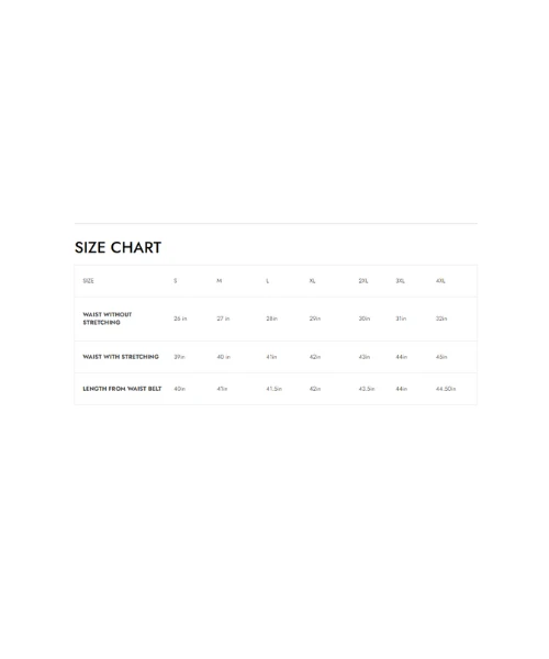| LENGTH FROM WAIST BELT | 40in | 41in | 41.5in | 42in | 43.5in | 44in | 44.50in |