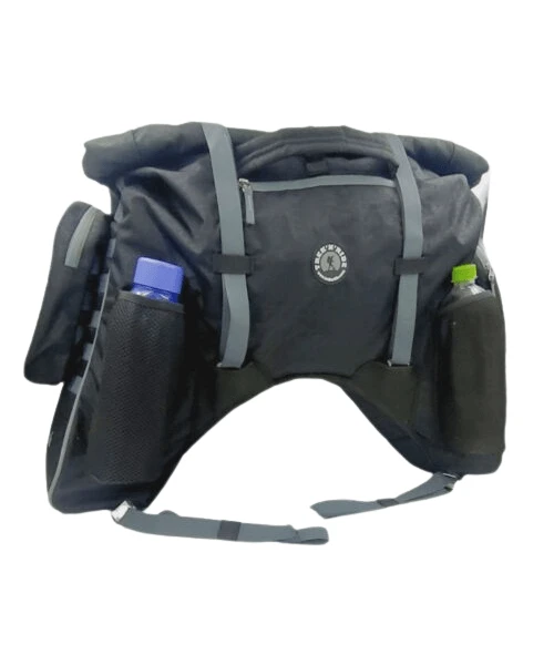 - A universal roll-top motorcycle saddle-cum-tail bag with waterproof inner lining.