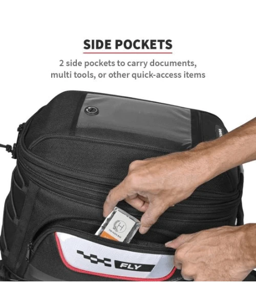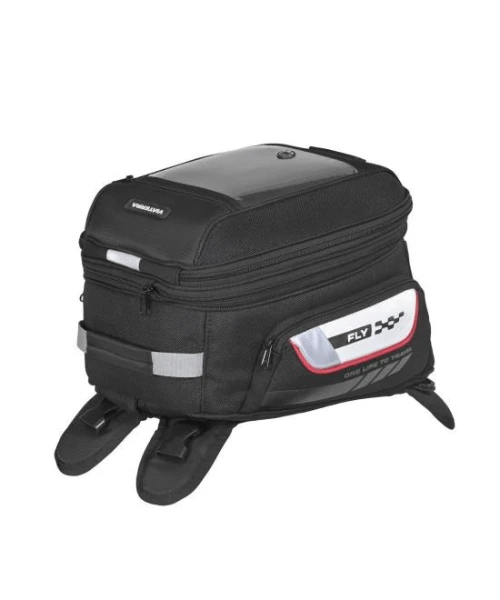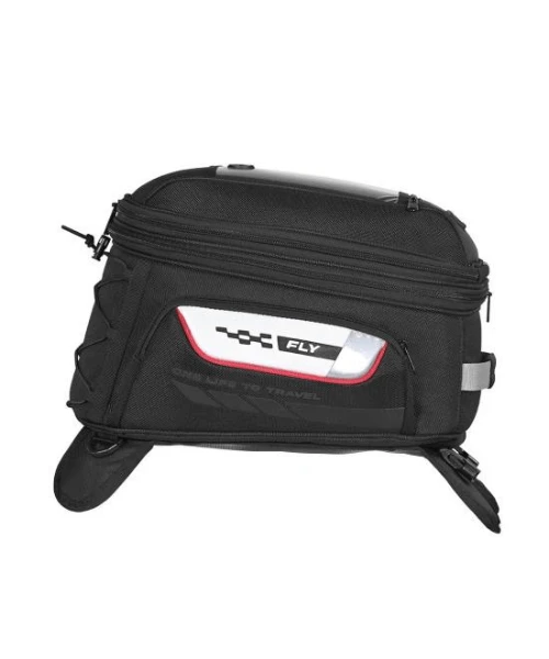 - Constructed from EVA laminated fabric and with PP support to retain shape, The strap based system fits universally on all fuel tanks and comes with an external rain/ dust cover. Fly tankbag’s hassle free buckle detachments make it easy to mount/ unmount – very convenient for everyday commute use.Â