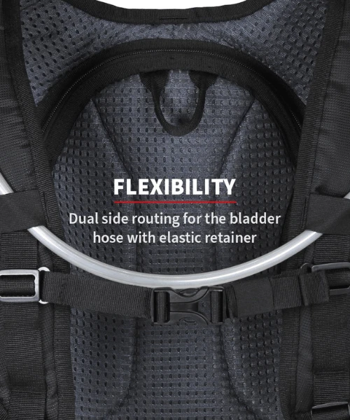 - Dual side routing for the bladder hose with elastic retainer