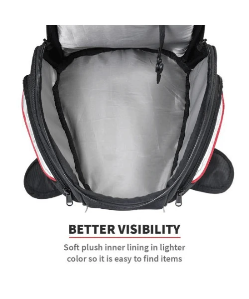 - Large No 8 zipper which is easy to grab and operate for opening & closing of the main compartment with riding gloves