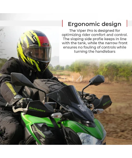 Ergonomic design: The Viper Pro is designed to optimize rider comfort and control. The sloping side profie keeps in line with the tank, while the narrow front ensures no fouling of controls while turning the handlebars.