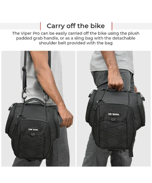 Carry off the bike: The Viper Pro can be easily carried off the bike using the plush padded grab handle, or as a sling bag with the detachable shoulder belt provided with the bag.