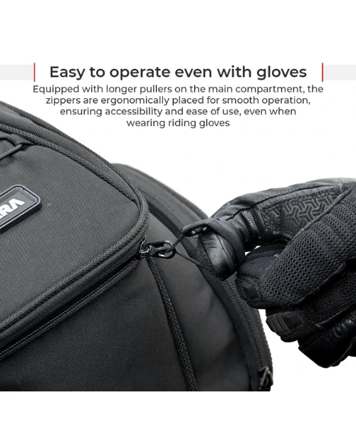 Easy to operate even with gloves: Equipped with longer pullers on the main compartment, the zippers are ergonomically placed for smooth operation, ensuring accessibility and ease of use, even when wearing riding gloves.
