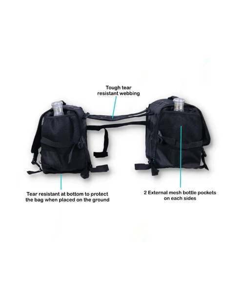 - 2 outside bottle pockets with tightening straps – can carry a 2 liter bottle
