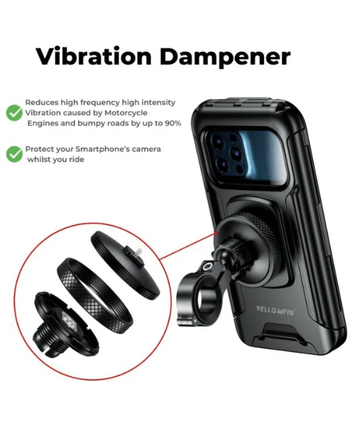 - The built-in Vibration Damper provides a stable grip for your device even on bumpy roads, making it an essential accessory for cycling & Bike enthusiasts and commuters alike.”